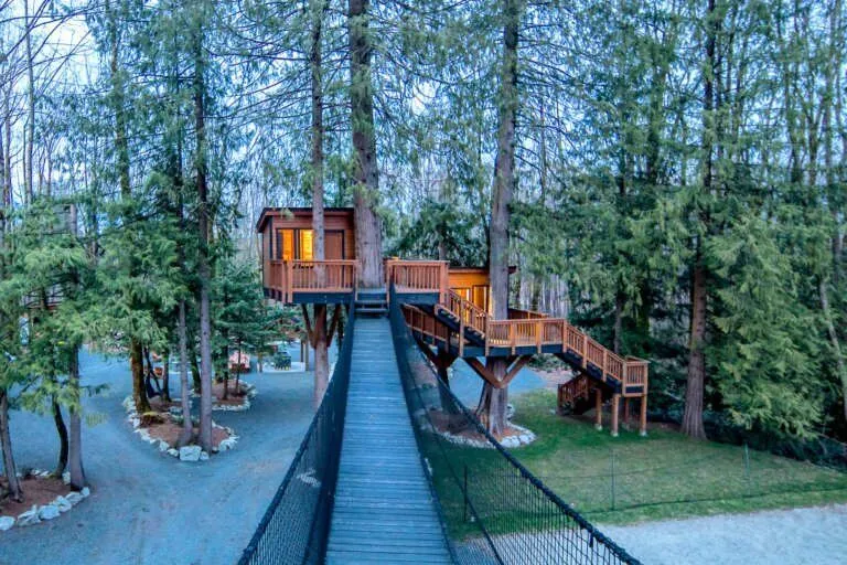 I stumbled upon this listing a while back and while it’s a beautiful home itself, I was awestruck by the custom built treehouse and suspension bridge that was out back. The two different treehouse spaces are not only high up…